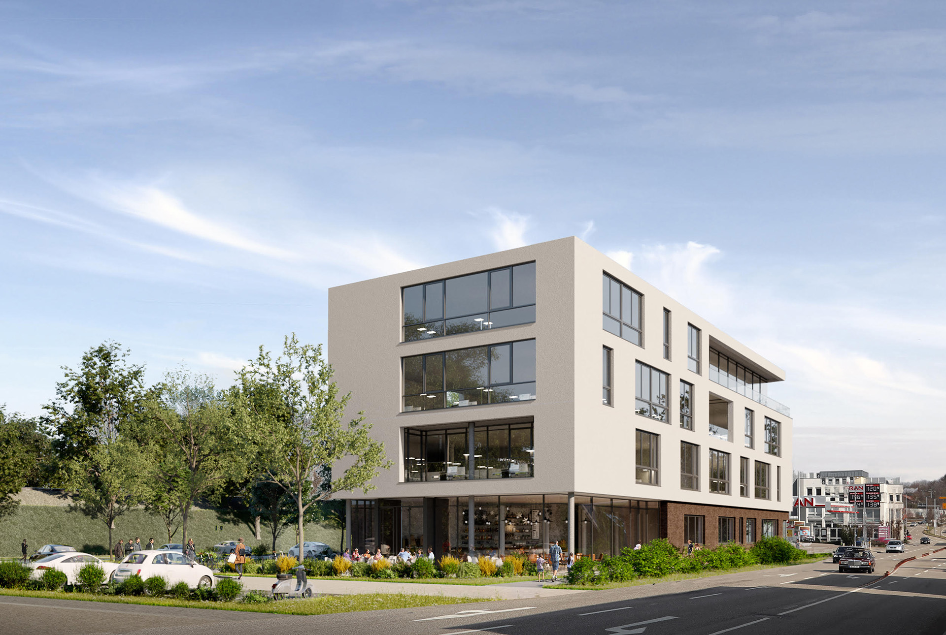 Der Investor des Gebäudes stellt großzügige und individuell zu gestaltende Büroflächen zur Verfügung, die in hellem Ambiente erstrahlen. Zudem befindet sich im Erdgeschoss eine einladende Bäckerei mit Cafe.