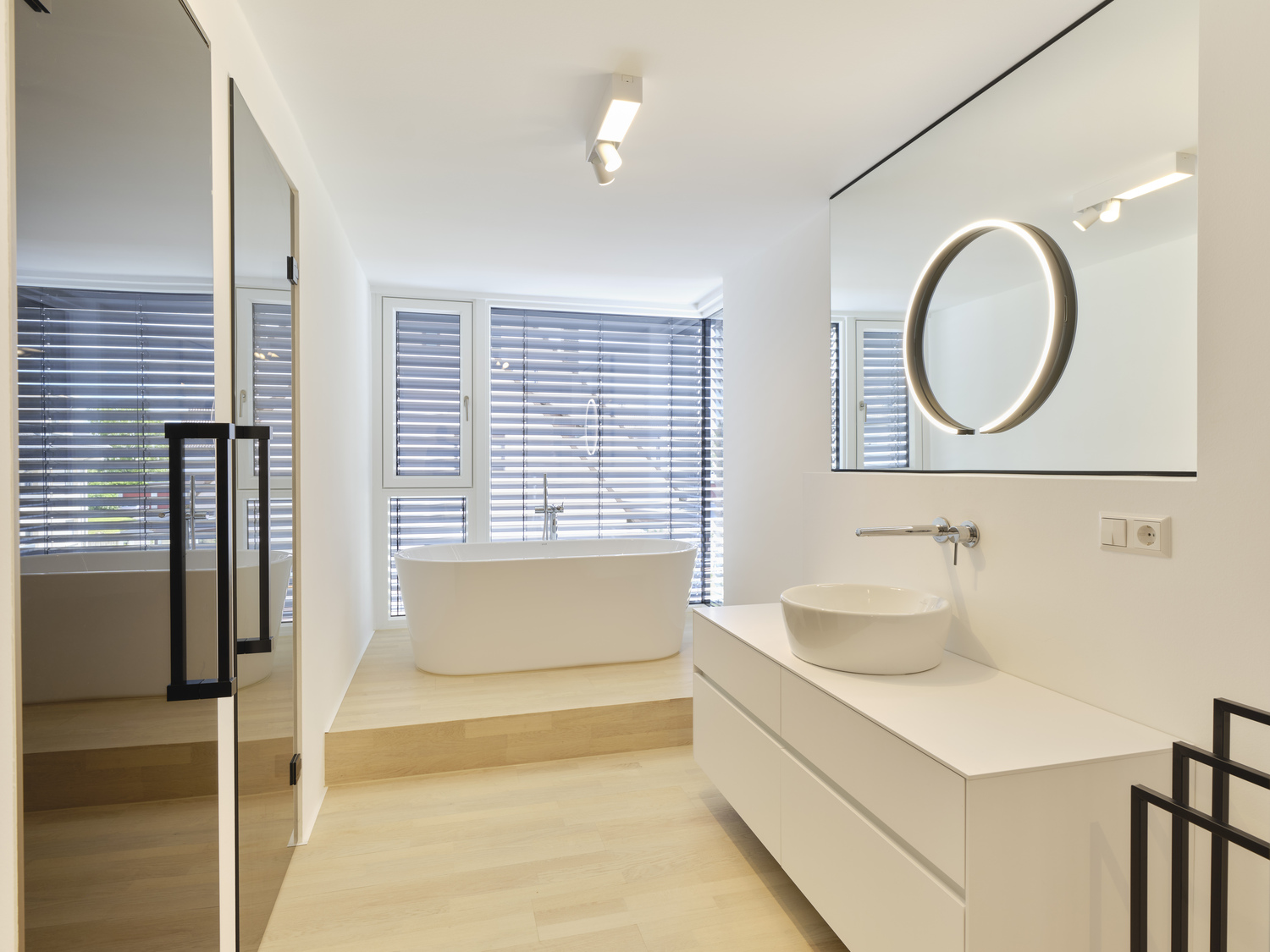 Ein Highlight: das Bad im Obergeschoss, das offen in den Flur integriert wurde. Die freistehende Badewanne, glänzende Armaturen sowie eine elegante Kombination aus Glas und Holz schaffen eine einladende, natürliche Atmosphäre. WC und Dusche bleiben stilvoll hinter schwarzen Glastüren verborgen und bieten diskreten Sichtschutz.